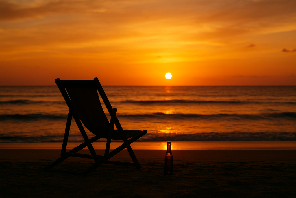 A row of long chairs, families sunk deep into them, beers stacked like rituals, children being shouted at over things so small they almost don’t exist, and adults pretending — pretending to relax, pretending to enjoy, pretending they are living a good life.